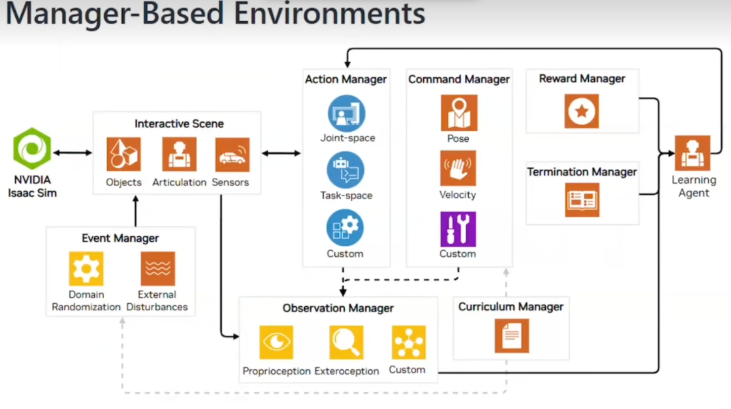 - IsaacLab 是 IsaacSim 之上的框架。下面两图是其两种工作方式,可认为除 NVIDIA Isaac Sim 的部分,即 IsaacLab。
