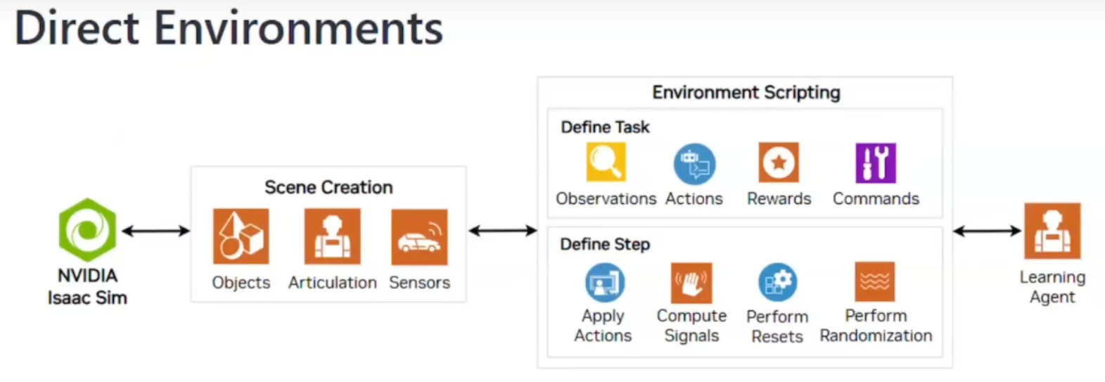 - IsaacLab 是 IsaacSim 之上的框架。下面两图是其两种工作方式,可认为除 NVIDIA Isaac Sim 的部分,即 IsaacLab。